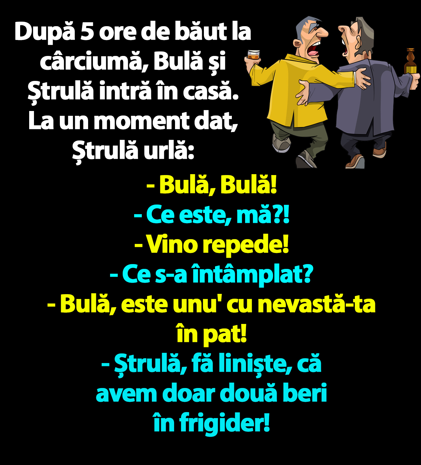 – Ștrulă, fă liniște, că avem doar două beri în frigider!”