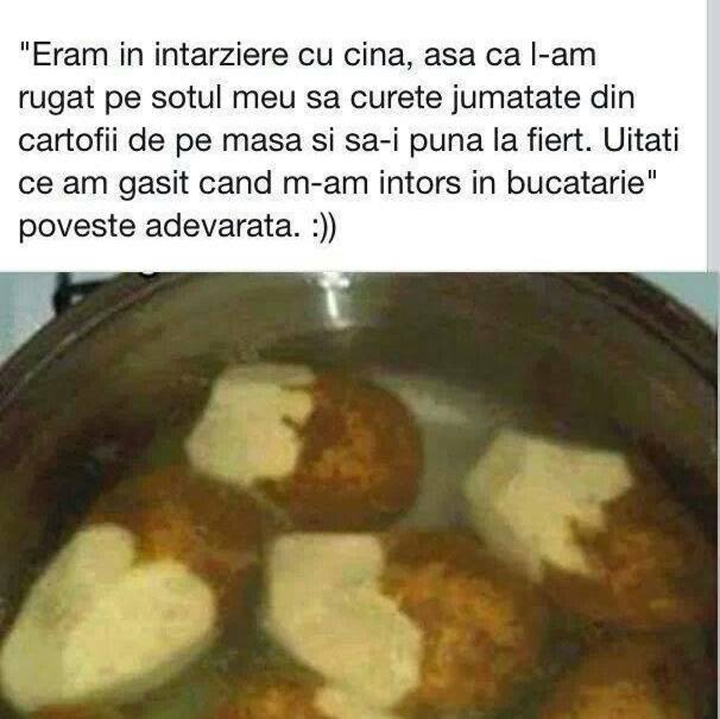 BANC | „Eram în întârziere, așa că l-am rugat pe soțul meu să curețe jumătate din cartofii de pe masă și să-i pună la fiert. Uitați ce am găsit!”