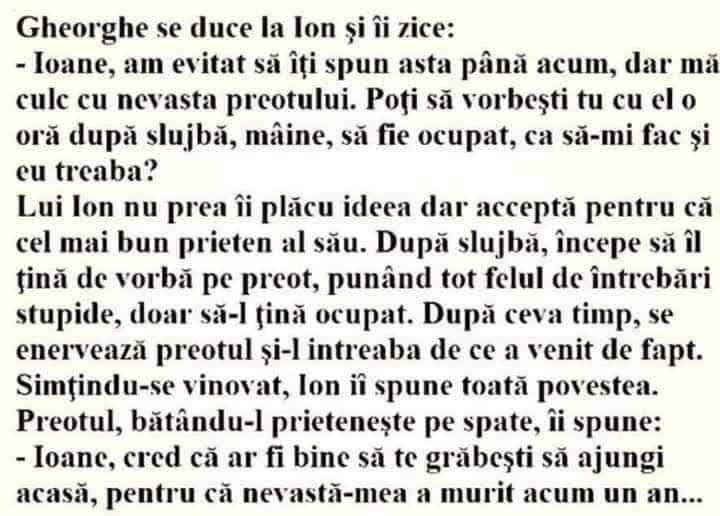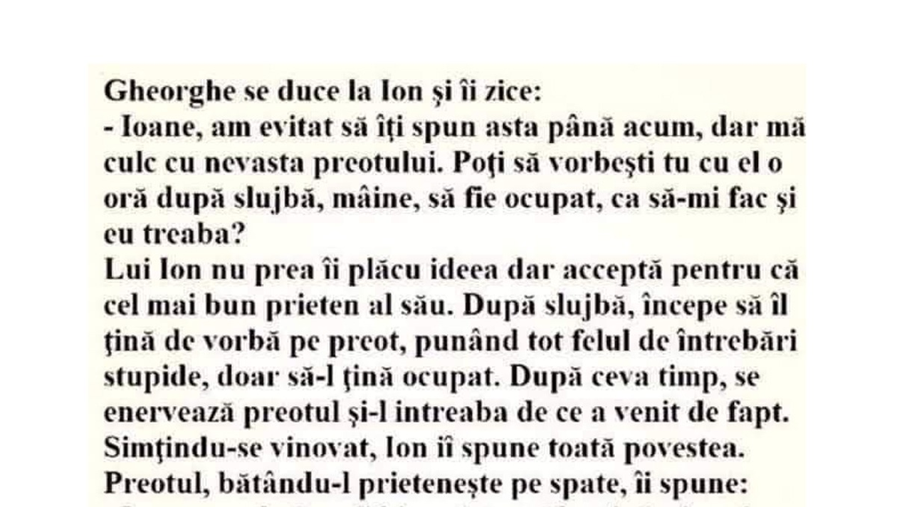 -Ioane, am evitat să îți spun asta până acum, dar mă culc cu nevasta preotului. Poți să vorbești tu cu el o oră după slujbă, mâine, să fie ocupat, ca să-mi fac și eu treaba?