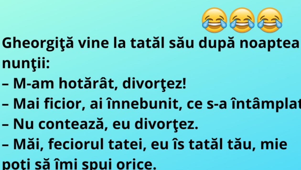 Chiar dacă este abia luni, noi dăm deja startul distracției. Redacția CANCAN.ro v-a pregătit un banc savuros, care va stârni amuzamentul! Protagonistul de astăzi este Gheorghiță, care se duce la tatăl său după noaptea nunții. Spor la distracție și la voie bună!