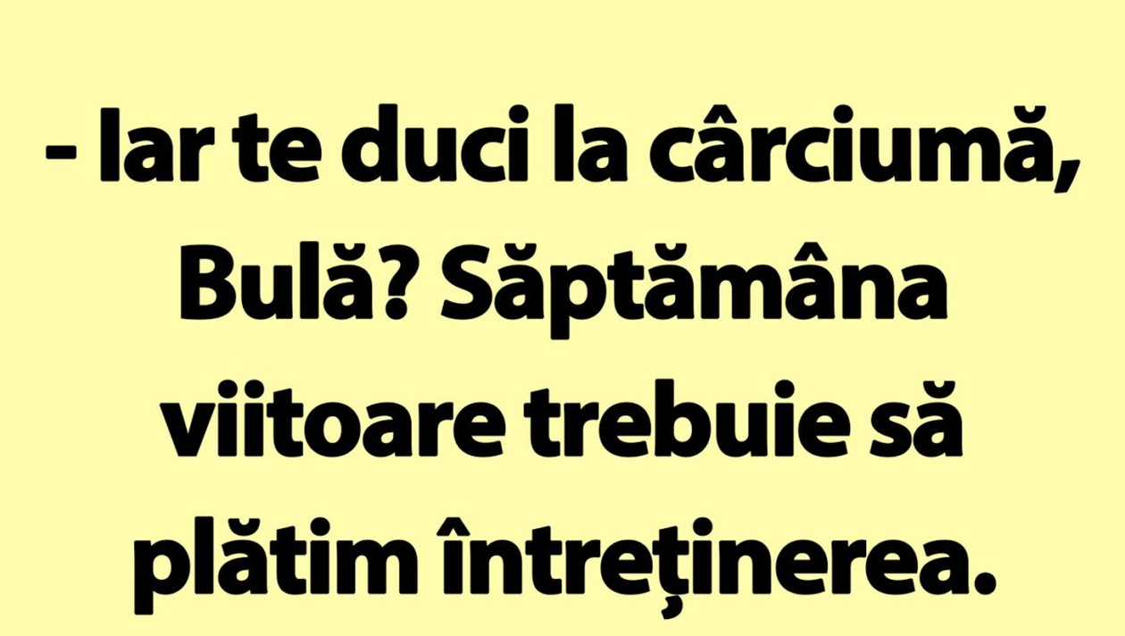 Ziua bună se cunoaște încă de dimineață, așa că trebuie începută cu zâmbetul pe buze. Iar pentru asta am pregătit un banc care cu siguranță te va amuza copios. Protagoniștii de astăzi sunt Bulă și Bubulina. El vrea să plece la cârciumă, iar ea este preocupată de lucruri ceva mai practice. Deznodământul este hilar.