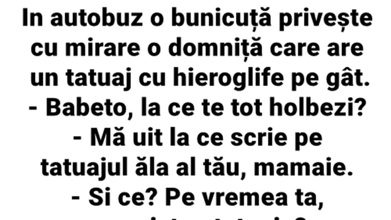 Dragi cititori, bancul zilei vă va aduce cu siguranță zâmbetul pe buze. Discuția haioasă între o tânără tatuată și o bătrână, în autobuz, a devenit virală.