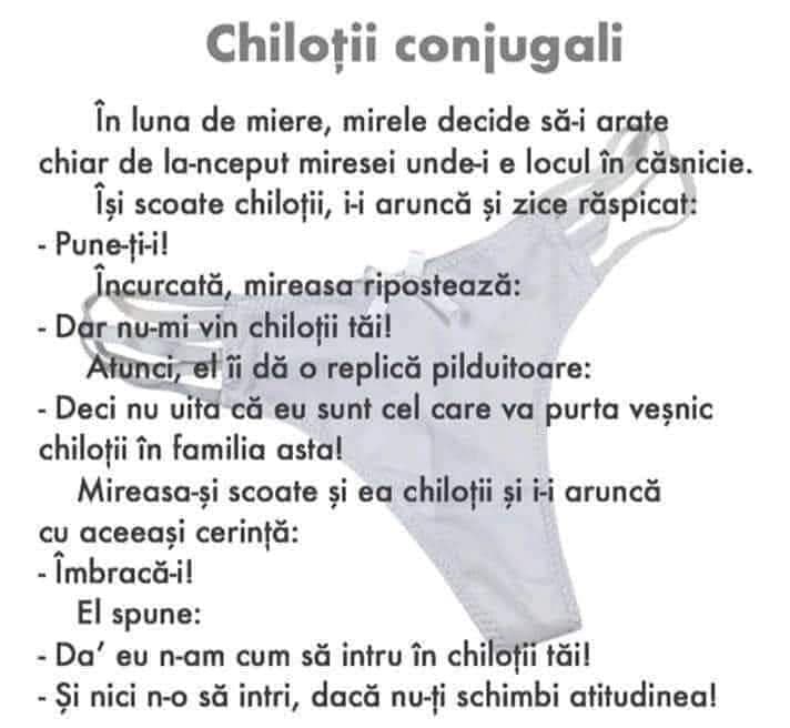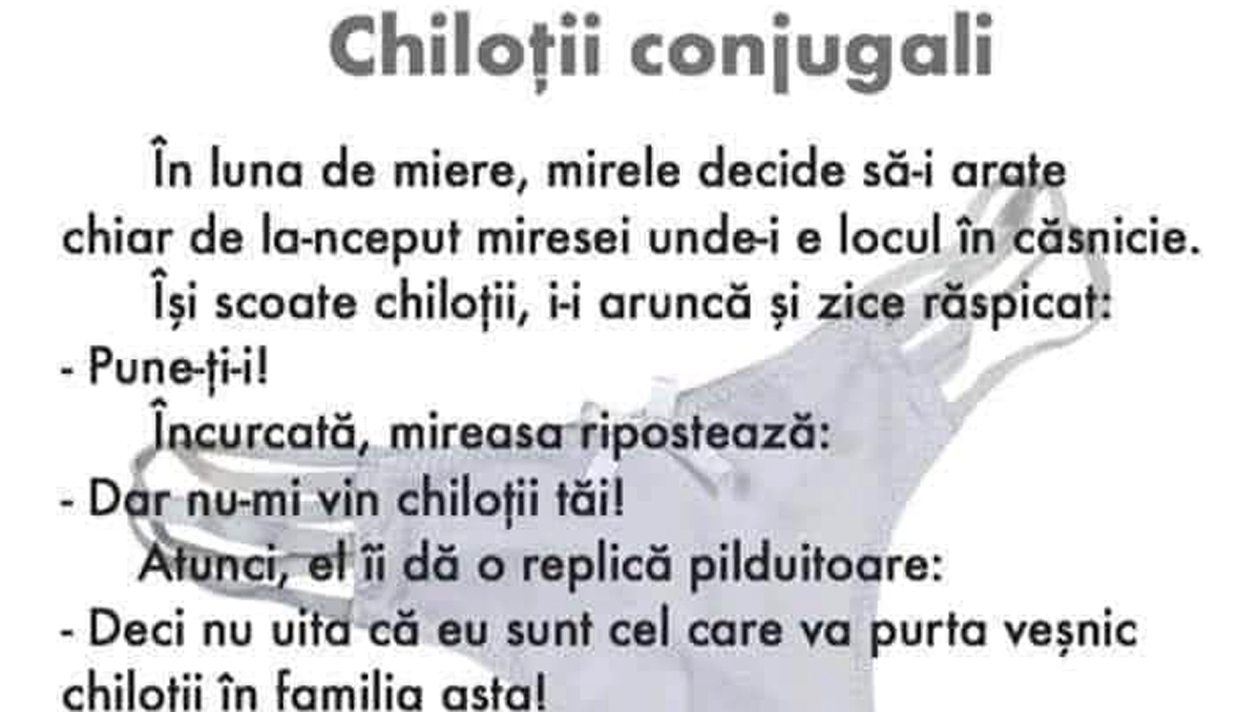În luna de miere, mirele decide să-i arate chiar de la-nceput miresei unde-i e locul în căsnicie. Își scoate chiloții, i-i aruncă și zice răspicat: