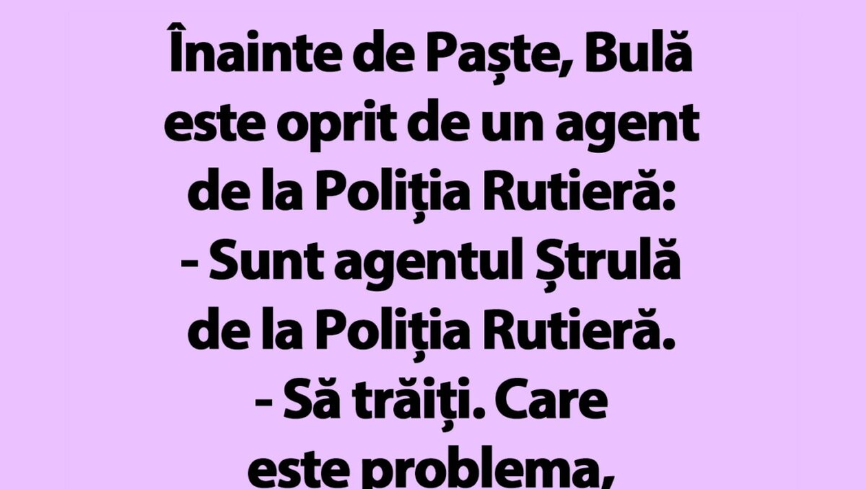 Dragi cititori, CANCAN.RO v-a pus la dispoziție un banc amuzant, care te va face să râzi în hohote. Bulă este oprit de un polițist rutier în trafic, înainte de Paște. Ce a descoperit omul legii în portbagajul mașinii?