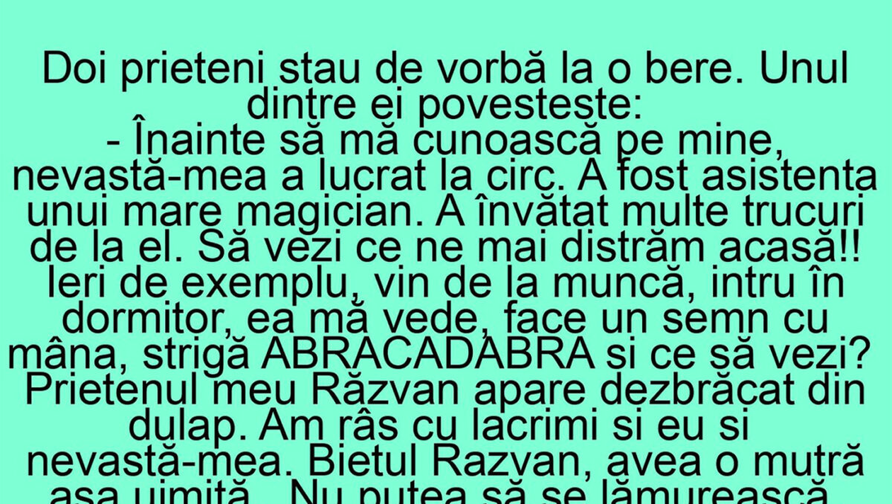 -Înainte să mă cunoască pe mine, nevastă-mea a lucrat la circ. A fost asistenta unui mare magician. A învățat multe trucuri de la el. Să vezi ce ne mai distrăm acasă! Ieri, de exemplu, vin de la muncă, intru în dormitor, ea mă vede, face un semn cu mâna, strigă Abracadabra și ce să vezi? Prietenul meu Răzvan apare dezbrăcat din dulap. Am râs cu lacrimi. Și eu și nevastă-mea. Bietul Răzvan avea o mutră așa uimită. Nu putea să se lămurească, săracul, cum naiba de a ajuns așa dintr-odată, dezbrăcat, la mine în dulap”, este bancul zilei.