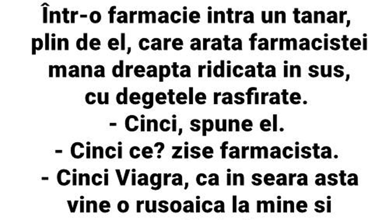 – Cinci Viagra, că în seara asta vine o rusoaică la mine și vreau să fiu în formă.