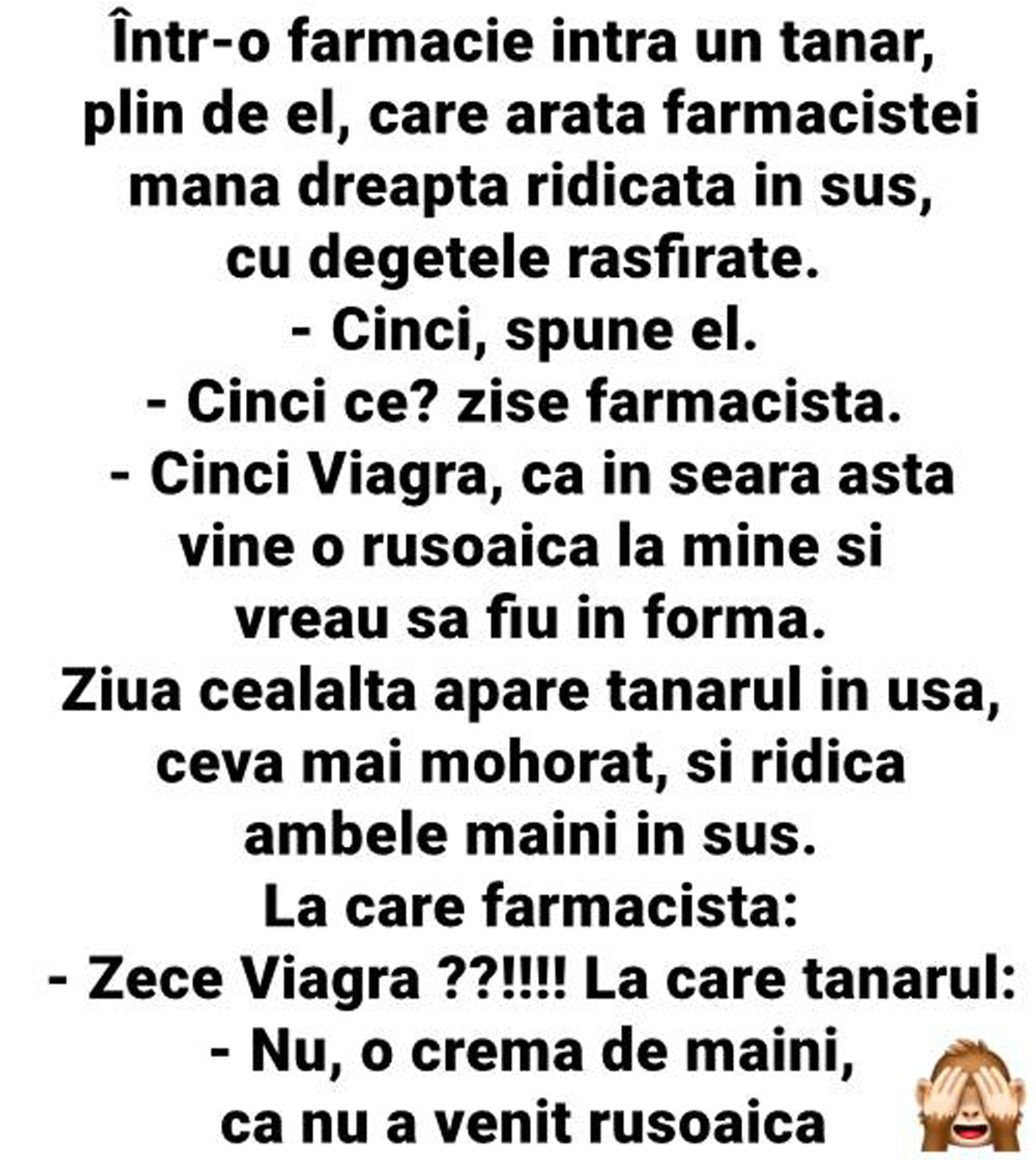 Într-o farmacie intră un tânăr, plin de el, care arată farmacistei mâna dreaptă, ridicată în sus, cu degetele răsfirate.