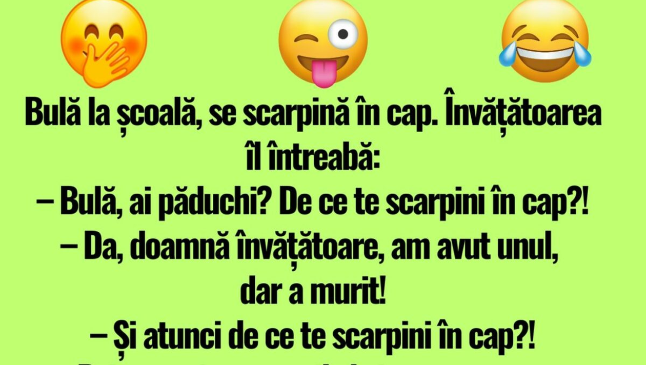 Azi e luni, considerată a fi una dintre cele mai grele și neplăcute zile din săptămână, așa că echipa CANCAN.ro a decis să vă amuze! Avem pentru voi un banc haios, cu deja celebrul Bulă, care face ce face și le comite! De data asta, e la școală și are o problemă extrem de neplăcută… și anume păduchi!