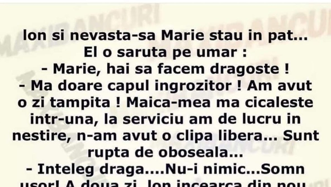-Ce dracu-i cu tine, Ioane?! Ai devenit maniac sexual? Trei nopți la rând?!”, este bancul zilei.