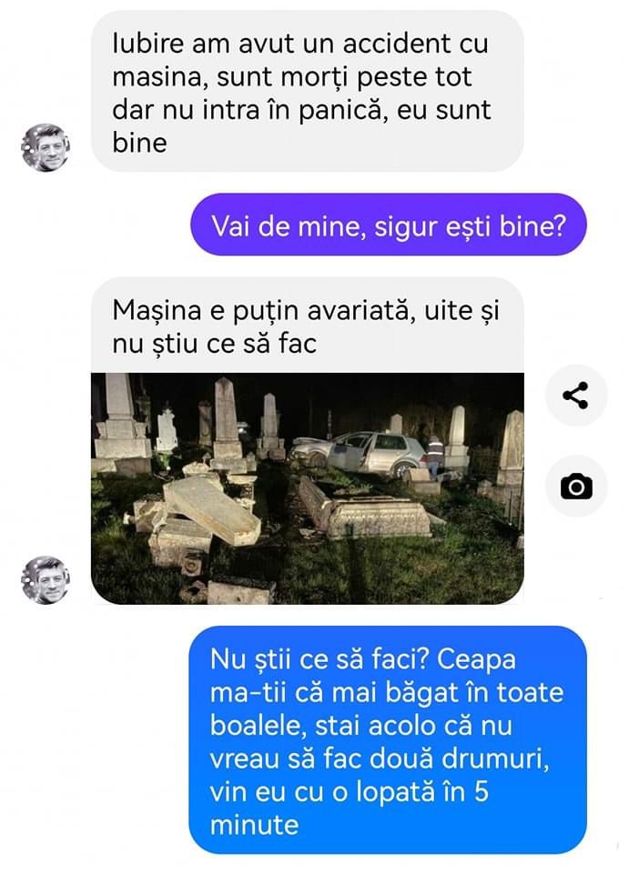 „-Iubire, am avut un accident cu mașina, sunt morți peste tot, dar nu intra în panică, eu sunt bine.