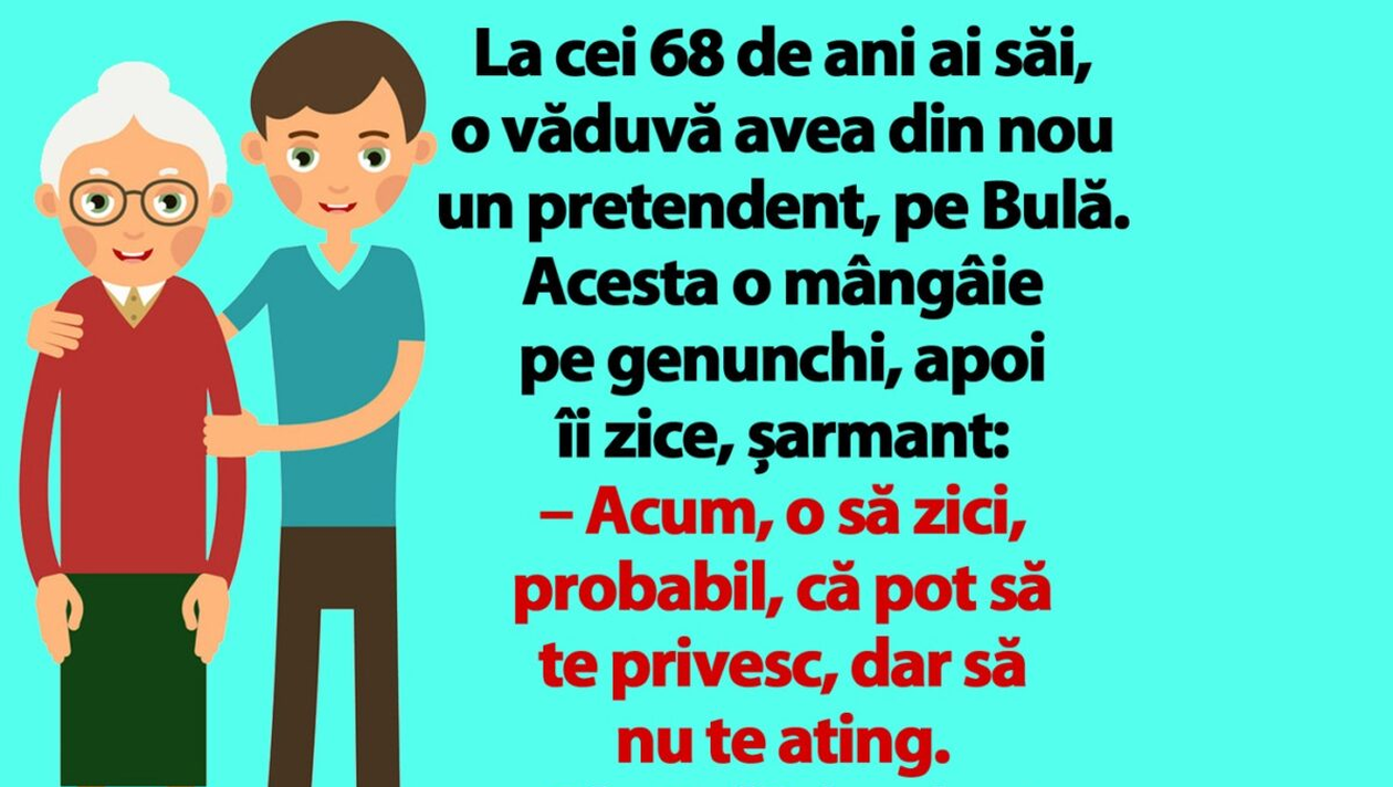 „La cei 68 de ani ai săi, o văduvă avea din nou un pretendent, pe Bulă. Acesta o mângâie pe genunchi, apoi îi zice, șarmant: