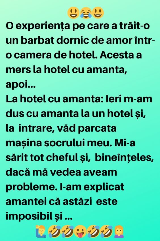 La hotel cu amanta: Ieri m-am dus cu amanta la un hotel și, la intrare, văd parcata mașina socrului meu. Mi-a sărit tot cheful și, bineînțeles, dacă mă vedea aveam probleme. I-am explicat amantei că astăzi este imposibil și a plecat supărată. De nervi, i-am rupt ambele oglinzi și am plecat acasă. A doua zi m-am dus sa-l vad și sa râd de el că nu mai are oglinzi la mașină. Era foarte suparat și îl întreb: