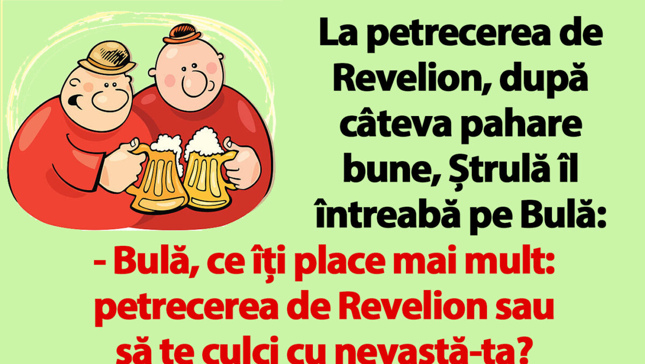 Este ultima zi din acest an, iar CANCAN.RO vrea să o petreceți numai cu voie bună și veselie. Așa că, vă punem la dispoziție o glumă amuzantă cu Bulă și Ștrulă la Revelion. Conversația hilară dintre cei doi amici despre noaptea de Anul Nou. Vei râde cu lacrimi!