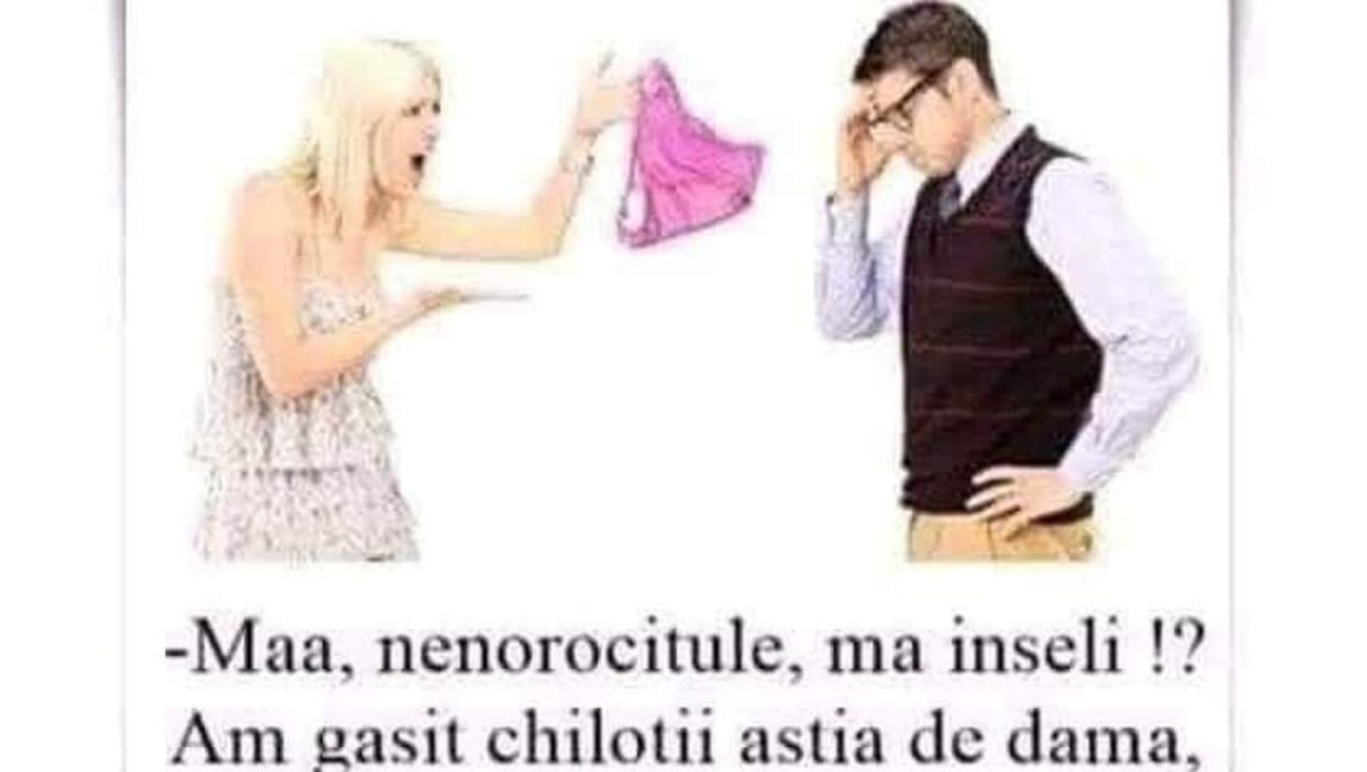 – Măăă, nenorocitule, mă înșeli!? Am găsit chiloții ăștia de damă, în buzunarul de la haina ta… – Da, iubito, mi i-a dat vecinul, a zis că i-ai uitat aseară la el!!