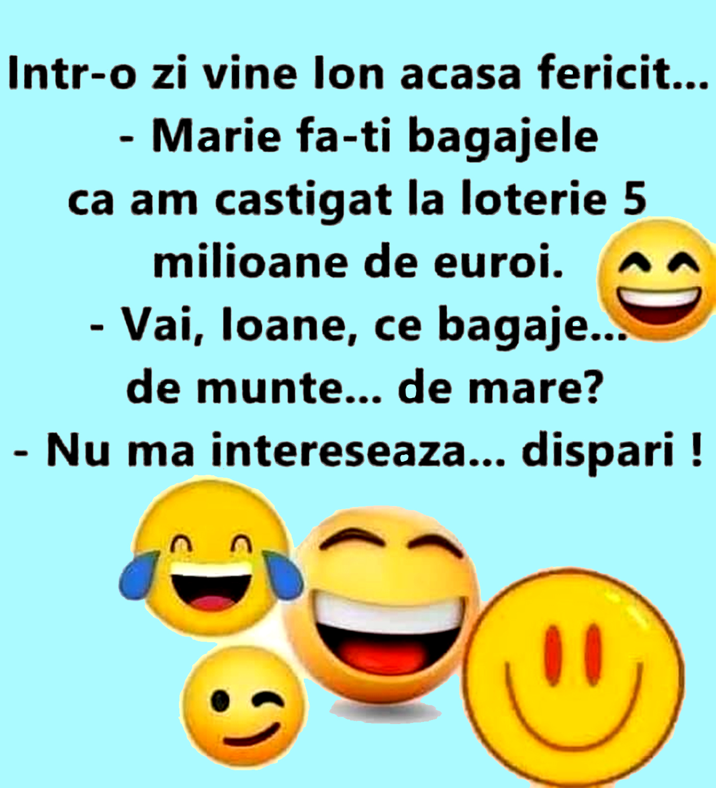 -Mărie, fă-ți bagajele, că am câștigat la loterie 5 milioane de euroi.