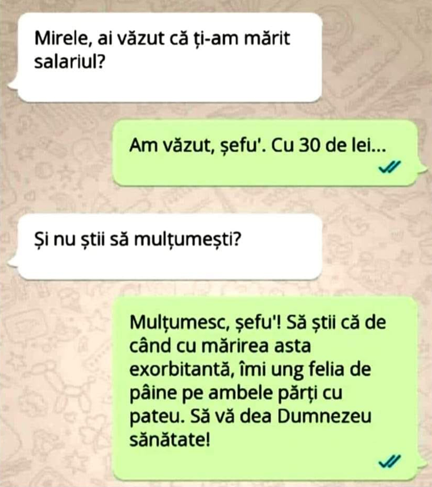 -Mulțumesc, șefu’! Să știi că de când cu mărirea asta exorbitantă, îmi ung felia de pâine pe ambele părți cu pate. Să vă dea Dumnezeu sănătate!”, este bancul zilei.