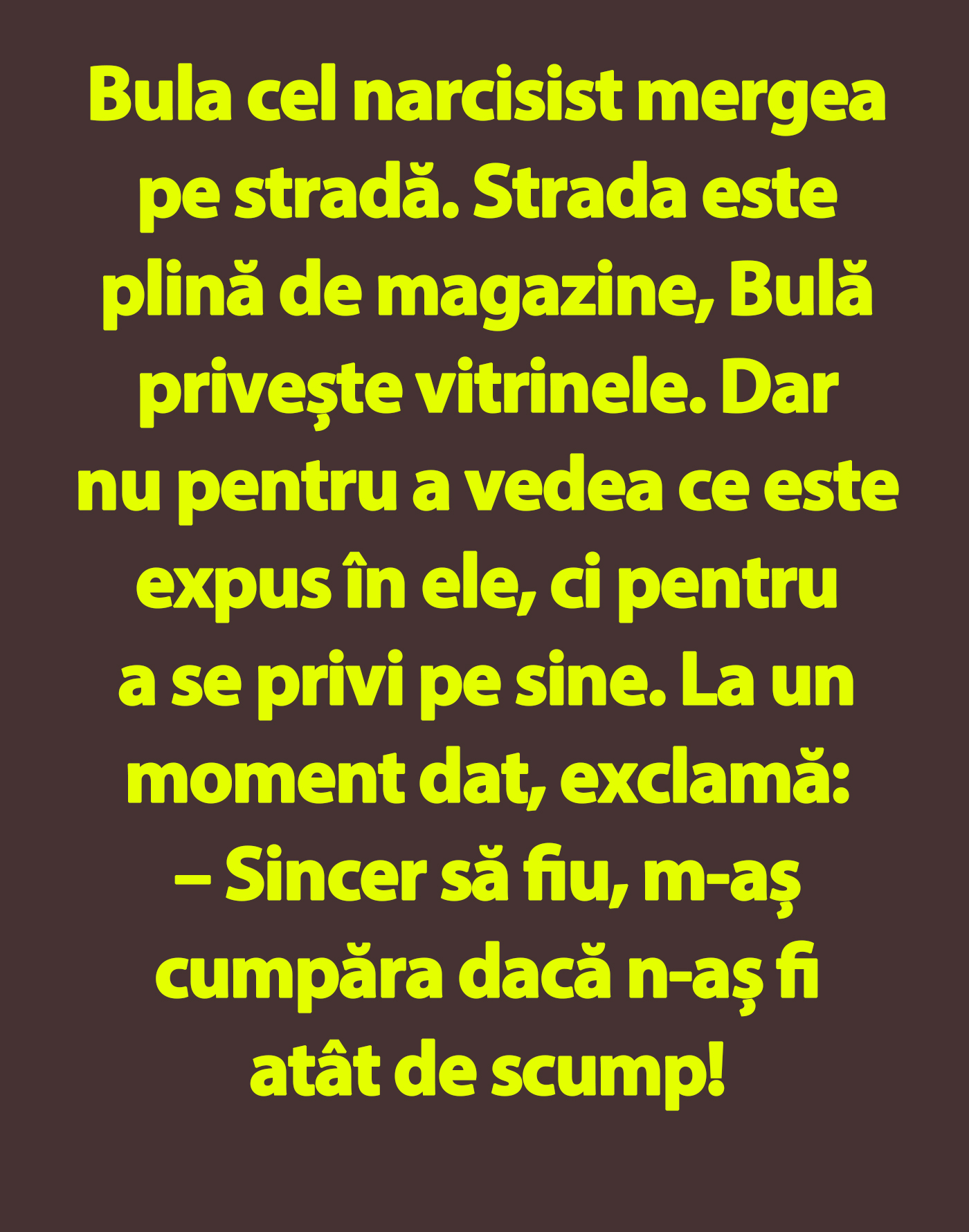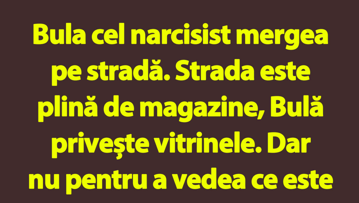 Bulă cel narcisist mergea pe stradă. Strada este plină de magazine, Bula privește vitrinele. Dar nu pentru a vedea ce este expus în ele, ci pentru a se privi pe sine. La un moment dat, exclamă: