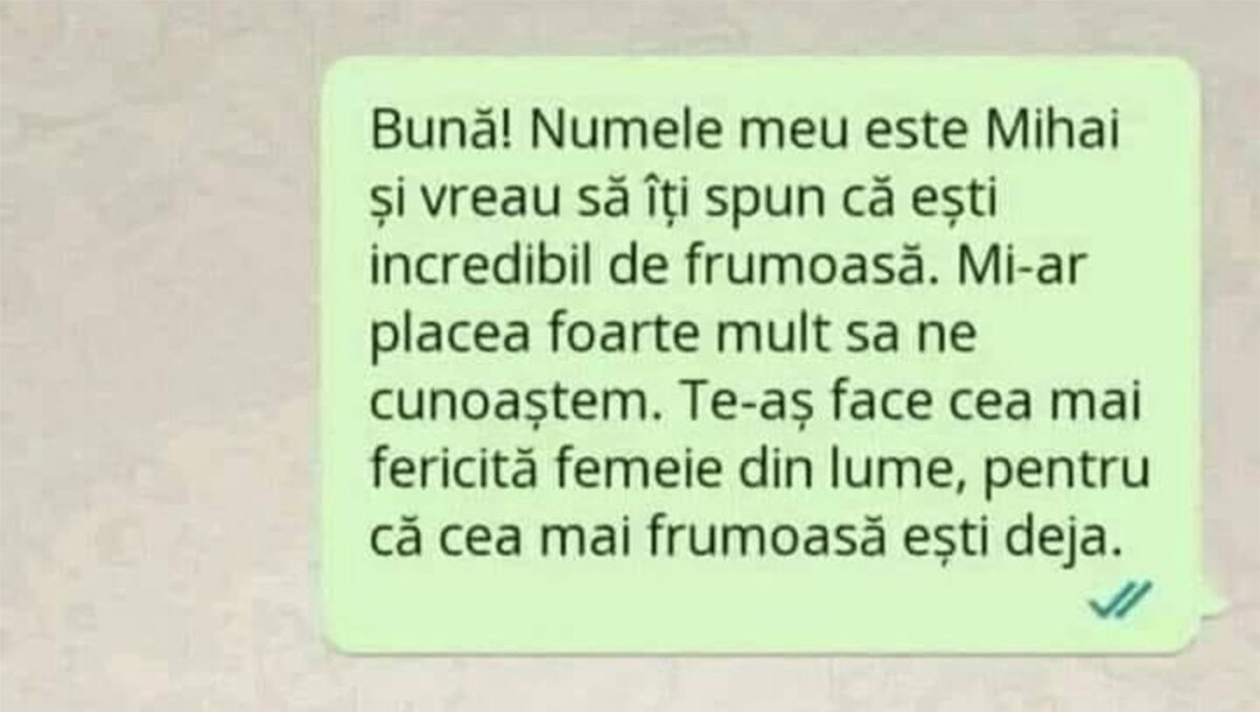 – Bună! Numele meu este Mihai şi vreau să îți spun că eşti incredibil de frumoasă. Mi-ar plăcea foarte mult sa ne cunoaștem. Te-aş face cea mai fericită femeie din lume, pentru că cea mai frumoasă eşti deja.