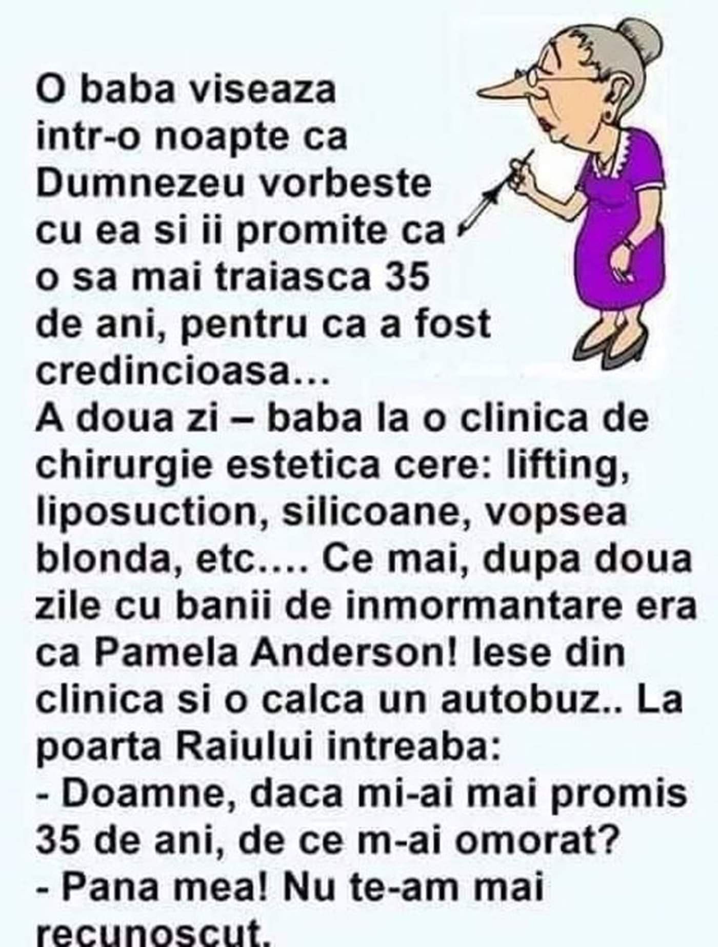 A doua zi, baba la o clinică de chirurgie estetică cere: lifting, liposucție, silicoane, vopsea blondă… Ce mai, după două zile, cu banii de înmormântare era ca Pamela Anderson!