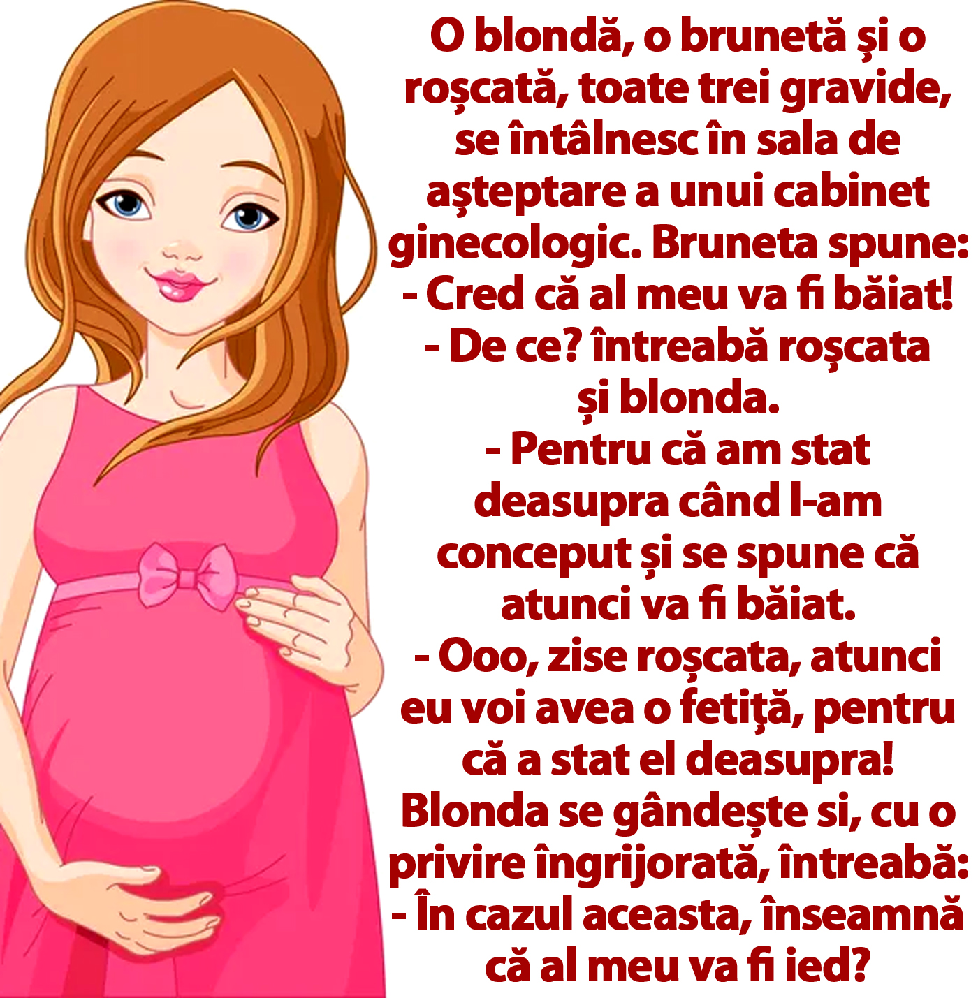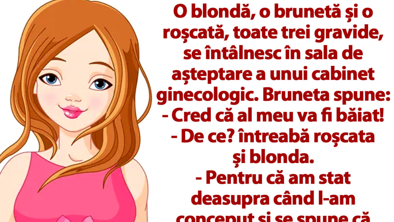 – Ooo, zise roșcata, atunci eu voi avea o fetiță, pentru că a stat el deasupra!