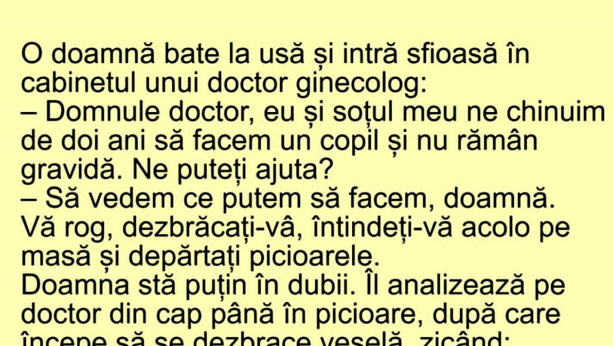 Dragă cititorule, CANCAN.RO ți-a pregătit un banc de nota 10. O doamnă bate la ușa unui cabinet de ginecologie și este întâmpinată de medicul care urmează să o consulte. Discuția dintre cei doi te va face să râzi cu gura până la urechi. Spor și voie bună!