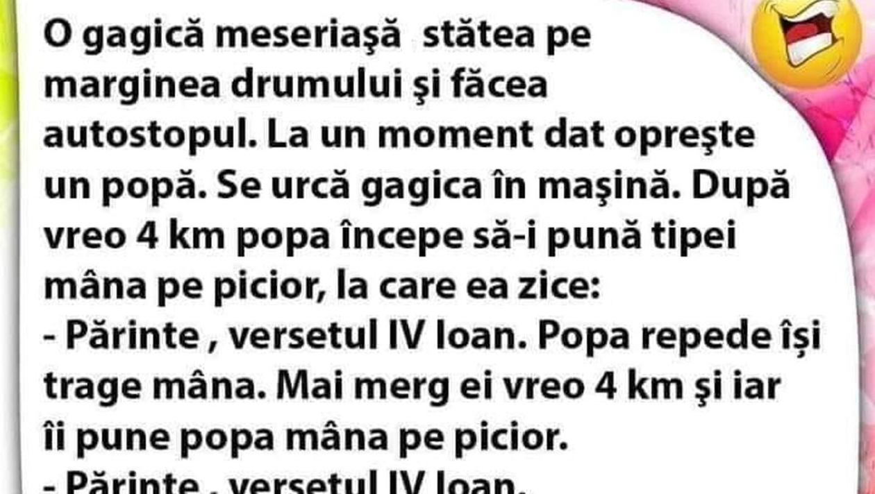 O gagică meseriașă stătea pe marginea drumului și făcea autostopul. La un moment dat oprește un popă. Se urcă gagica în mașină. După vreo 4km, popa începe să-i pună tipei mâna pe picior.