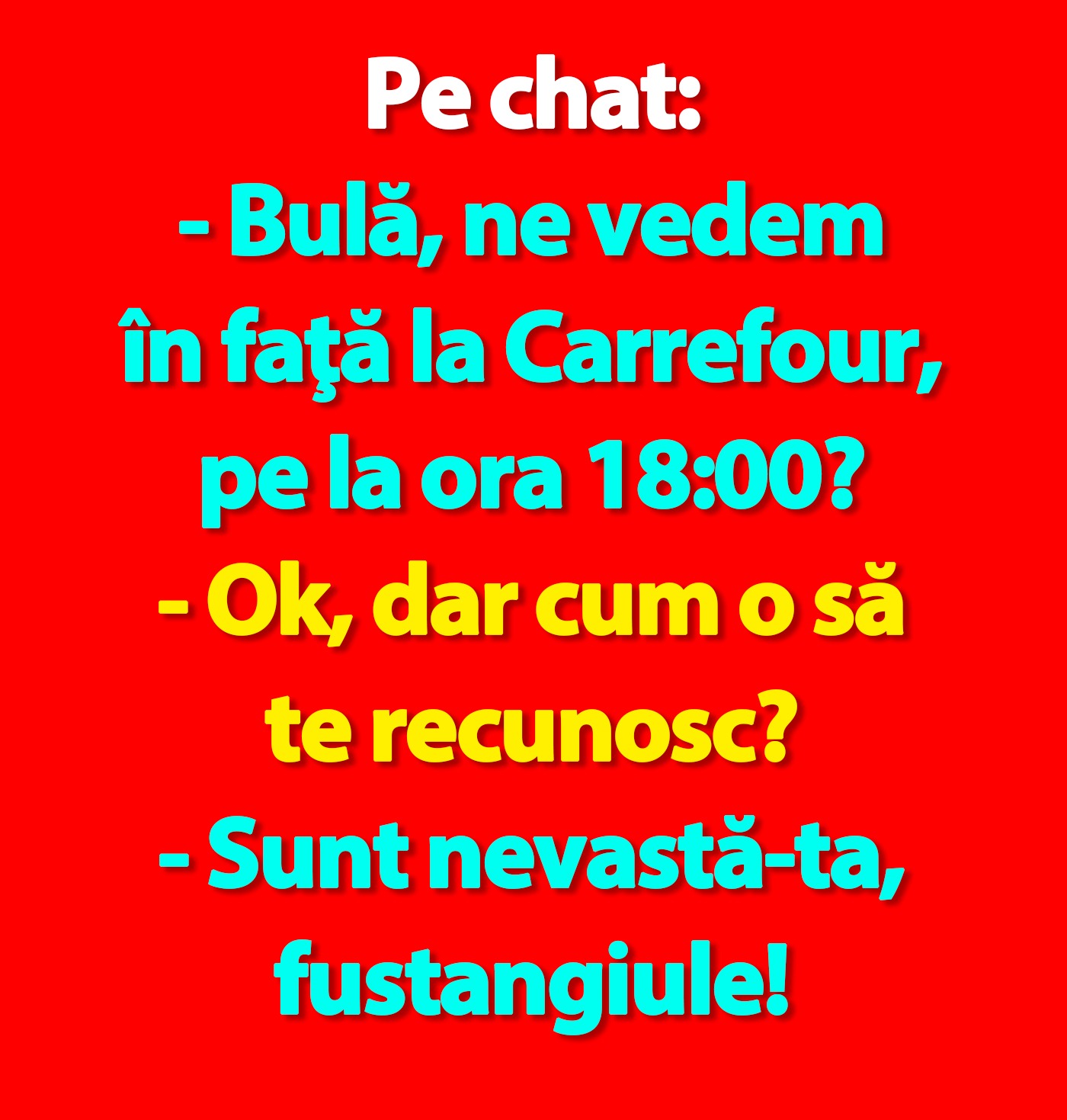 Acasă » Bancuri » BANC | Pe chat: „Bulă, ne vedem în faţă la Carrefour, pe la ora 18:00?”