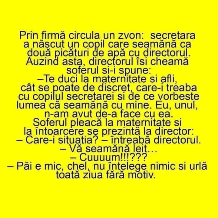 Prin firma circulă un zvon: secretara a născut un copil care seamănă că două picături de apă cu directorul. Auzind asta, directorul își cheamă șoferul și-i spune: