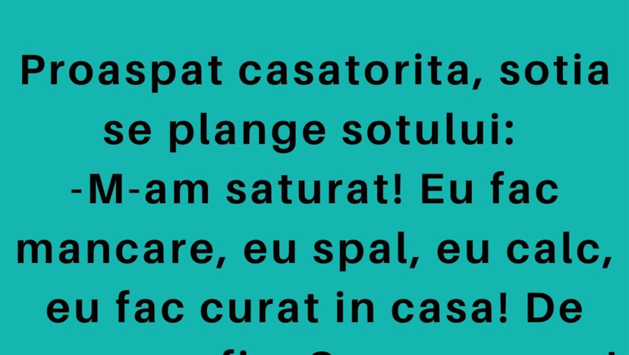 Dragă cititorule, CANCAN.RO ți-a pregătit un banc de nota 10. Discuția dintre doi tineri căsătoriți a devenit virală. Soția se plânge soțului că ea este singura care face mâncare, spală, calcă și face curățenie în casă. Răspunsul soțului te va face să râzi cu gura până la urechi. Spor și voie bună!