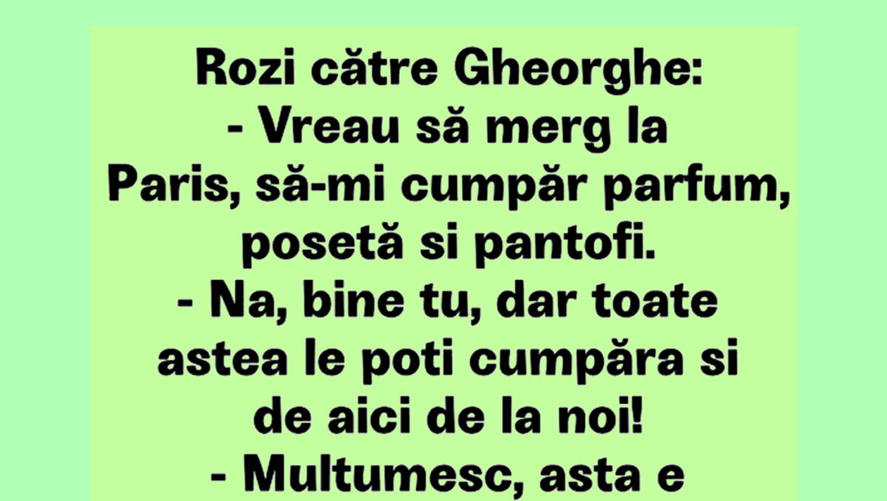 Banc. Astăzi, vă încântăm cu noi bancuri și dorim să vă transmitem energie pozitivă! Rozi și Gheorghe stau de vorbă. Partenera îi spune că vrea să meargă la Paris, pentru a-și achiziționa câteva obiecte. Totuși, Gheorghe nu se lasă mai prejos și îi răspunde direct! Dialogul stârnește amuzamentul! Spor la râs, dragi cititori.