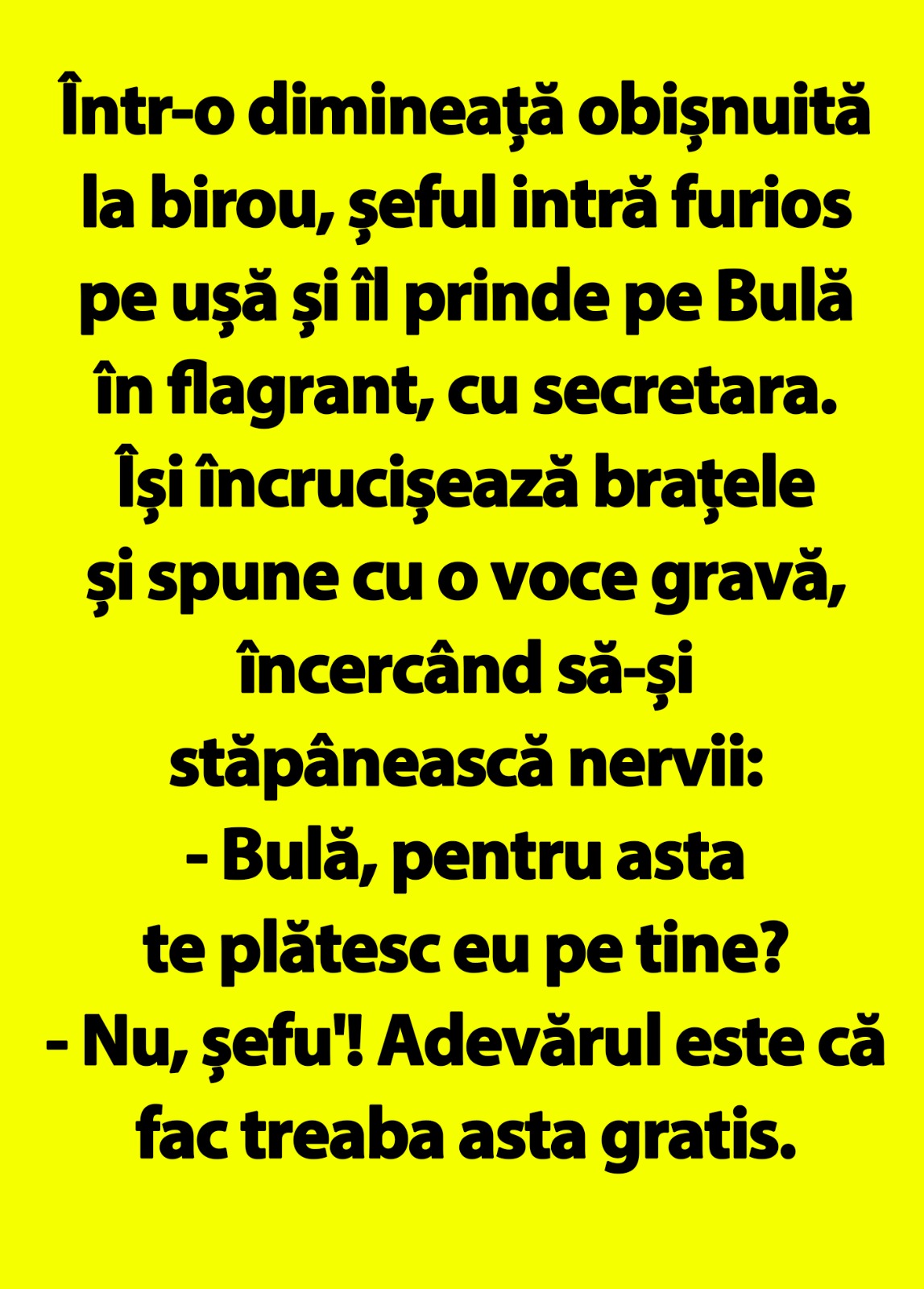 Într-o dimineață obișnuită la birou, șeful intră furios pe ușă și îl prinde pe Bulă în flagrant, cu secretara. Își încrucișează brațele și spune cu o voce gravă, încercând să-și stăpânească nervii:
