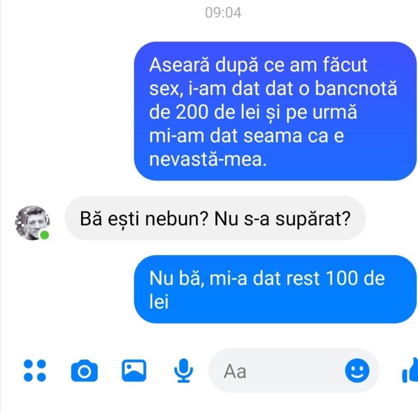 – Aseară, după ce am făcut sex, i-am dat o bancnotă de 200 de lei și pe urmă mi-am dat seama că e nevastă-mea.