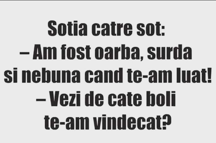 Acasă » Bancuri » BANC | Soția către soț: ”Am fost oarbă, surdă și nebună când te-am luat!”