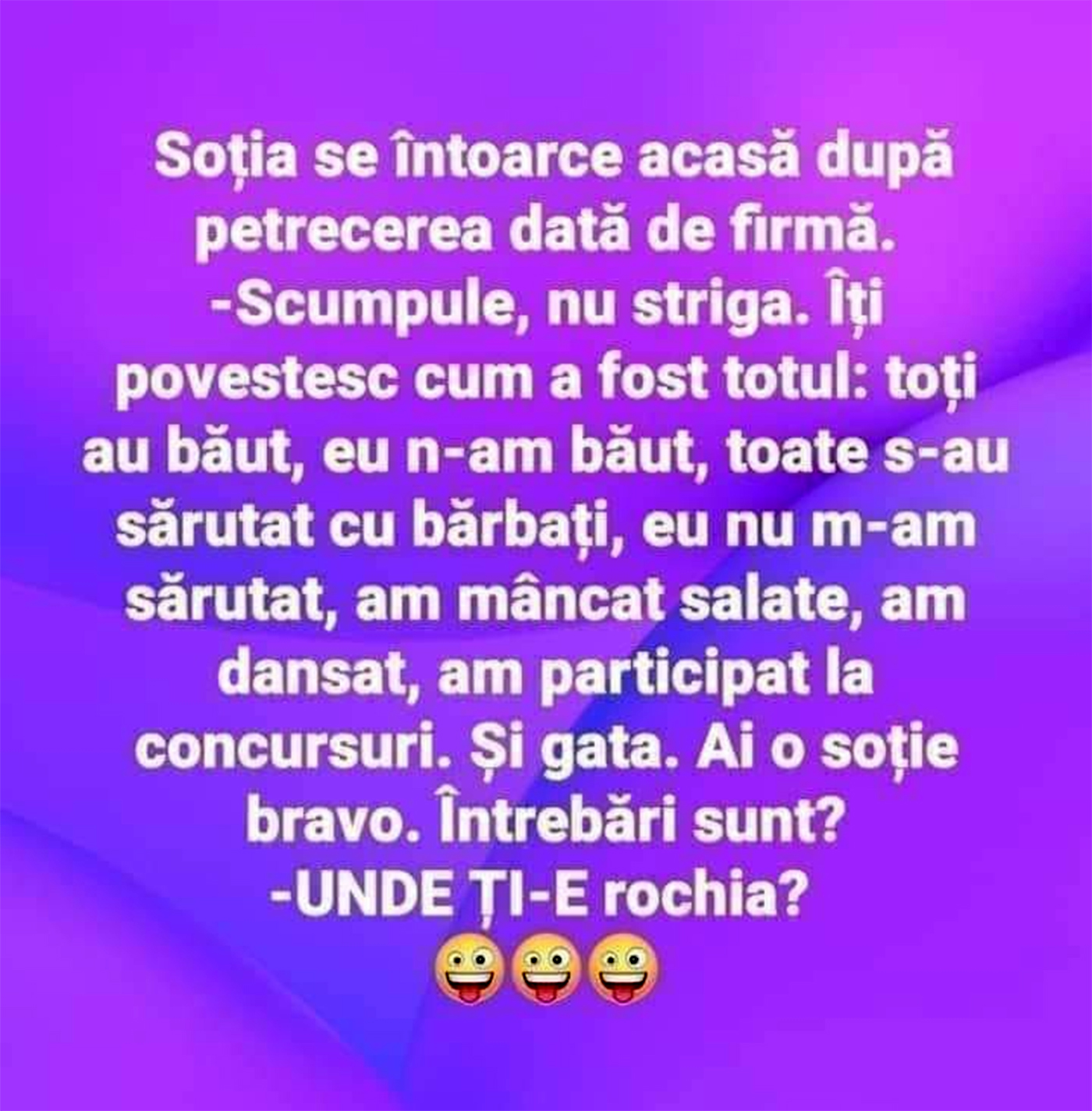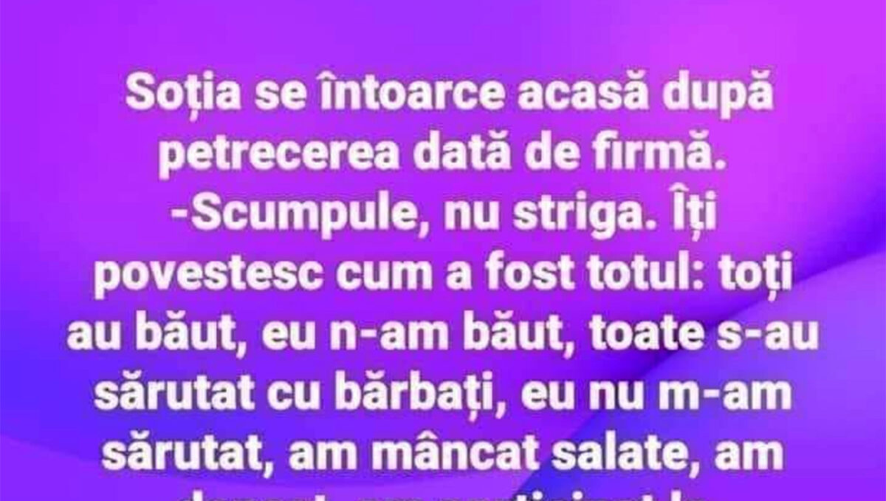-Scumpule, nu striga! Îți povestesc cum a fost totul: toți au băut, eu n-am băut, toate s-au sărutat cu bărbați, eu nu m-am sărutat, am mâncat salate, am dansat, am participat la concursuri și GATA. Ai o soție BRAVO. Întrebări sunt?