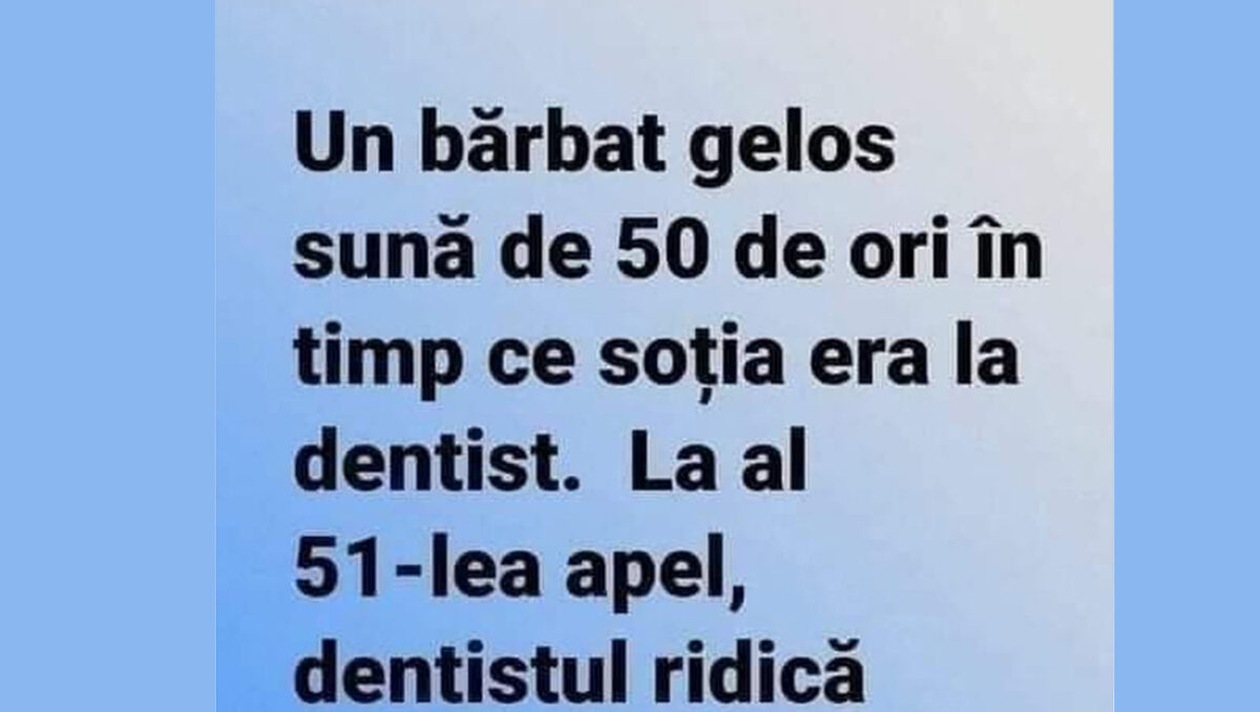 Banc. Astăzi, vă aducem în prim-plan noi bancuri haioase la care să râzi cu poftă! Un soț gelos își sună partenera aflată la dentist, pe scaun. După zeci de apeluri, cel care s-a încumetat să răspundă la telefon a fost chiar dentistul. Răspusul stârnește amuzament! Spor la râs!