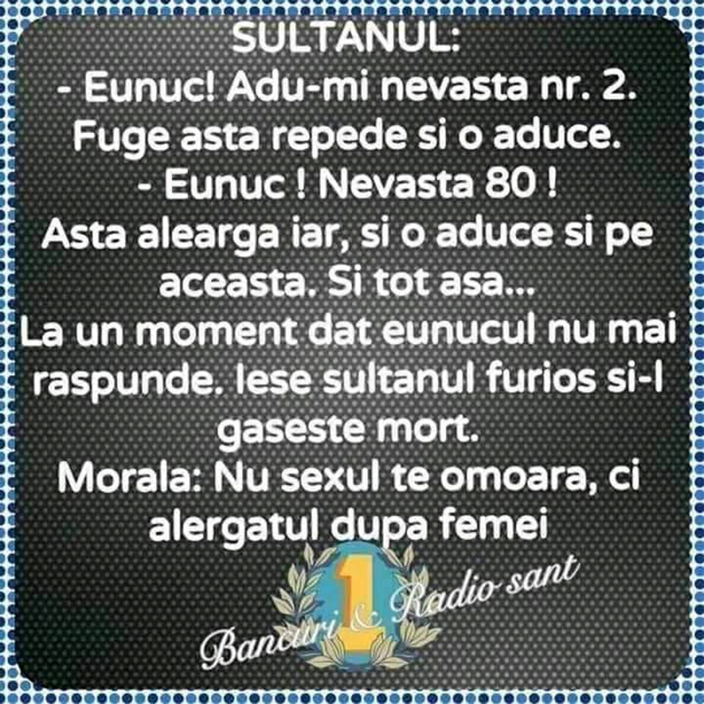 Ăsta aleargă iar și o aduce și pe aceasta. Și tot așa… La un moment dat, eunucul nu mai răspunde. Iese sultanul furios și-l găsește mort.