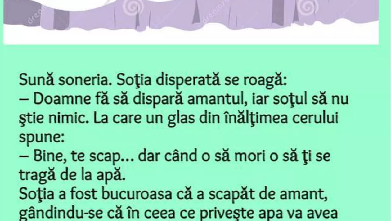– Doamne fă să dispară amantul, iar soțul să nu știe nimic. La care un glas din înălțimea cerului spune: