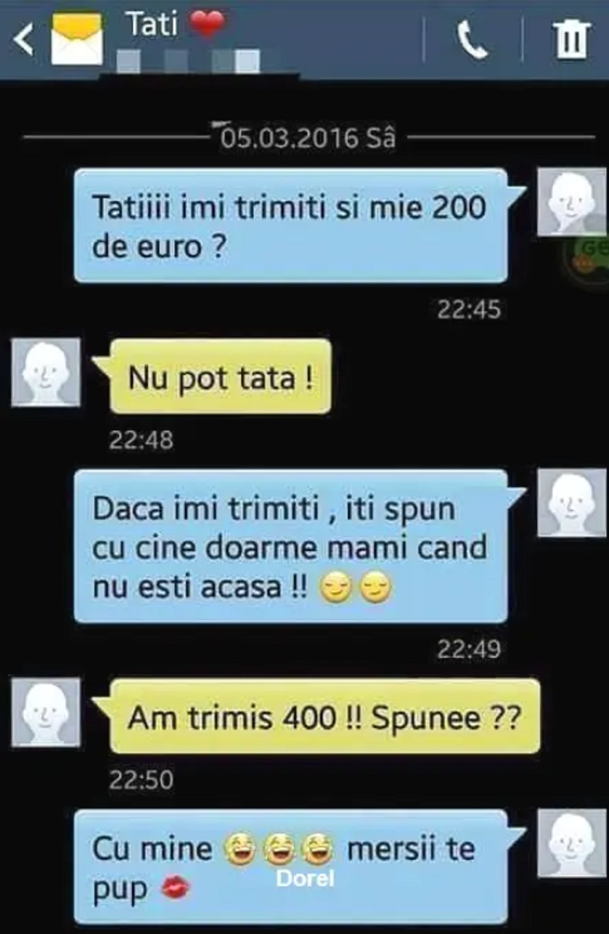 BANC | ”Tatiiii, îmi trimiți și mie 200 de euro? Dacă îmi trimiți, îți spun cu cine doame mama…”