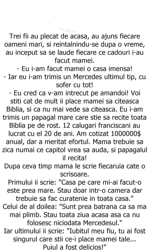 – Eu cred că v-am întrecut pe amândoi! Voi ştiţi cât de mult îi place mamei să citească Biblia şi că nu mai vede să citească. Eu i-am trimis un papagal mare care ştie să recite toată Biblia pe de rost. 12 calugări franciscani au lucrat cu el 20 de ani. Am cotizat un milionde euro anual, dar a meritat efortul. Mama trebuie să zică numai ce capitol vrea să audă şi papagalul îl recită!