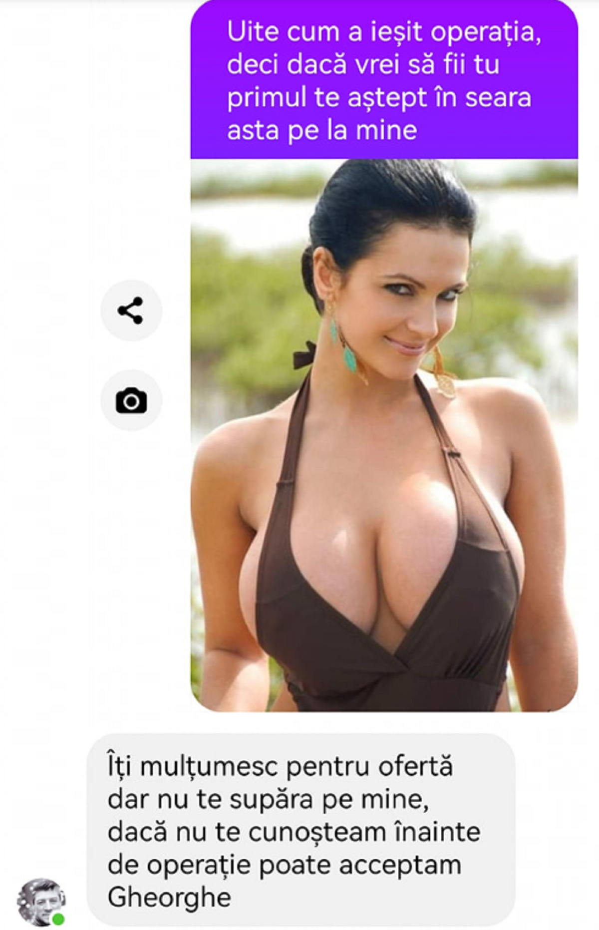 -Uite cum a ieșit operația, deci dacă vrei sa fii tu primul te aștept în seara asta pe la mine!