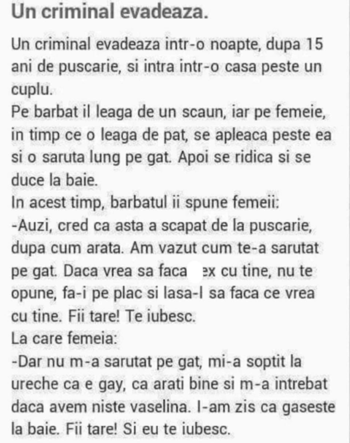 -Dar nu m-a sărutat pe gât, mi-a șoptit la ureche că e gay, că arăți bine și m-a întrebat dacă avem niște vaselină. I-am zis că găsește la baie. Fii tare! Și eu te iubesc!