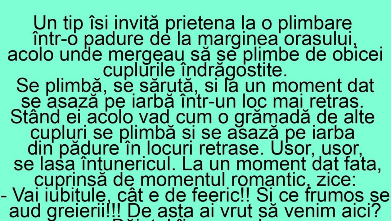 Bancul de azi redă o discuție mai neobișnuită dintre un cuplu tânăr care a ieșit la o întâlnire. Cei doi au ieșit la o plimbare prin parc, iar spre seară, tânăra s-a întrebat care este motivul pentru care iubitul ei a insistat să meargă în pădure. Răspunsul băiatului a fost cu adevărat neașteptat.