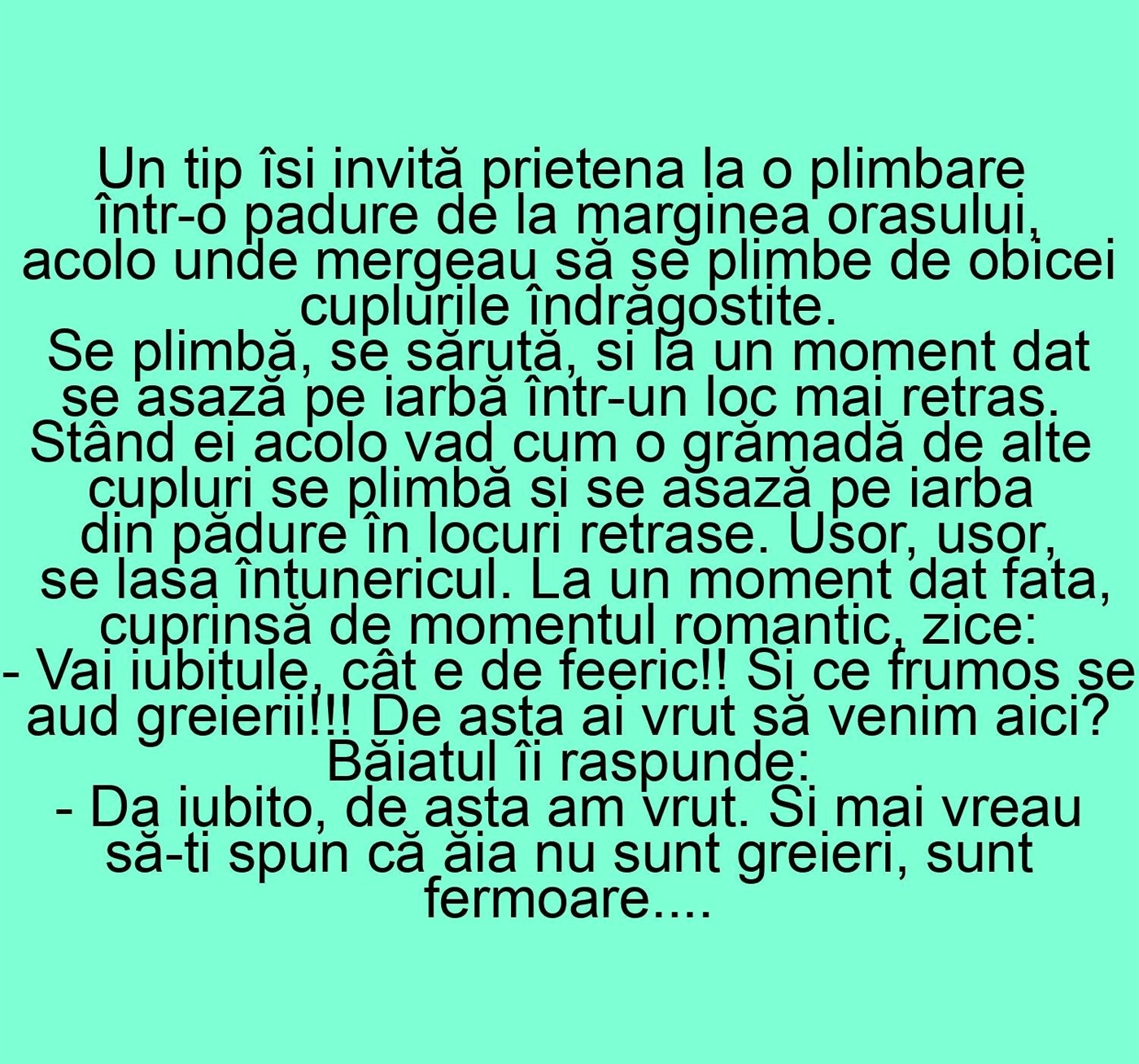 -Vai iubitule, cât e de feeric! Si ce frumos se aud greierii!!! De asta ai vrut să venim aici?