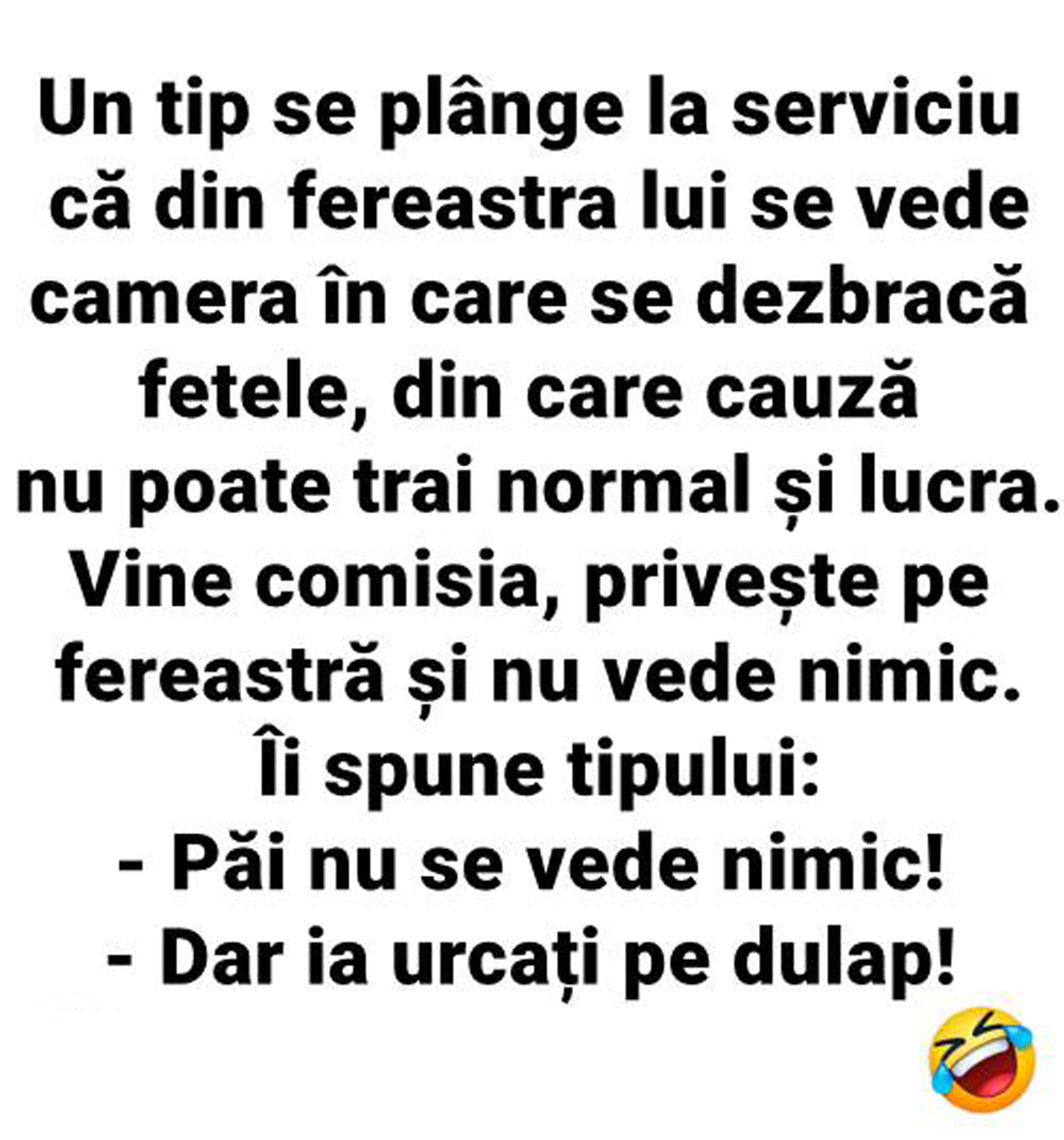Un tip se plânge la serviciu, că din fereastra lui, se vede camera în care se dezbracă fetele și nu se poate concentra. Vine comisia, privește pe pereastră și nu vede nimic.