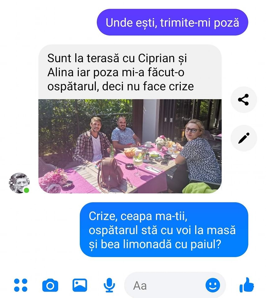-Sunt la terasă cu Ciprian și Alina, iar poza mi-a făcut-o ospătarul, deci nu face crize.