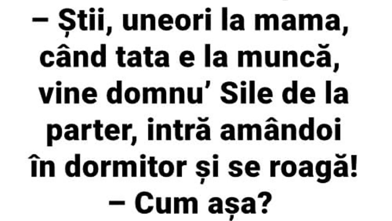 -Știi, uneori la mama, când tata e la muncă, vine domnu Sile de la parter, intră amândoi în dormitor și se roagă!