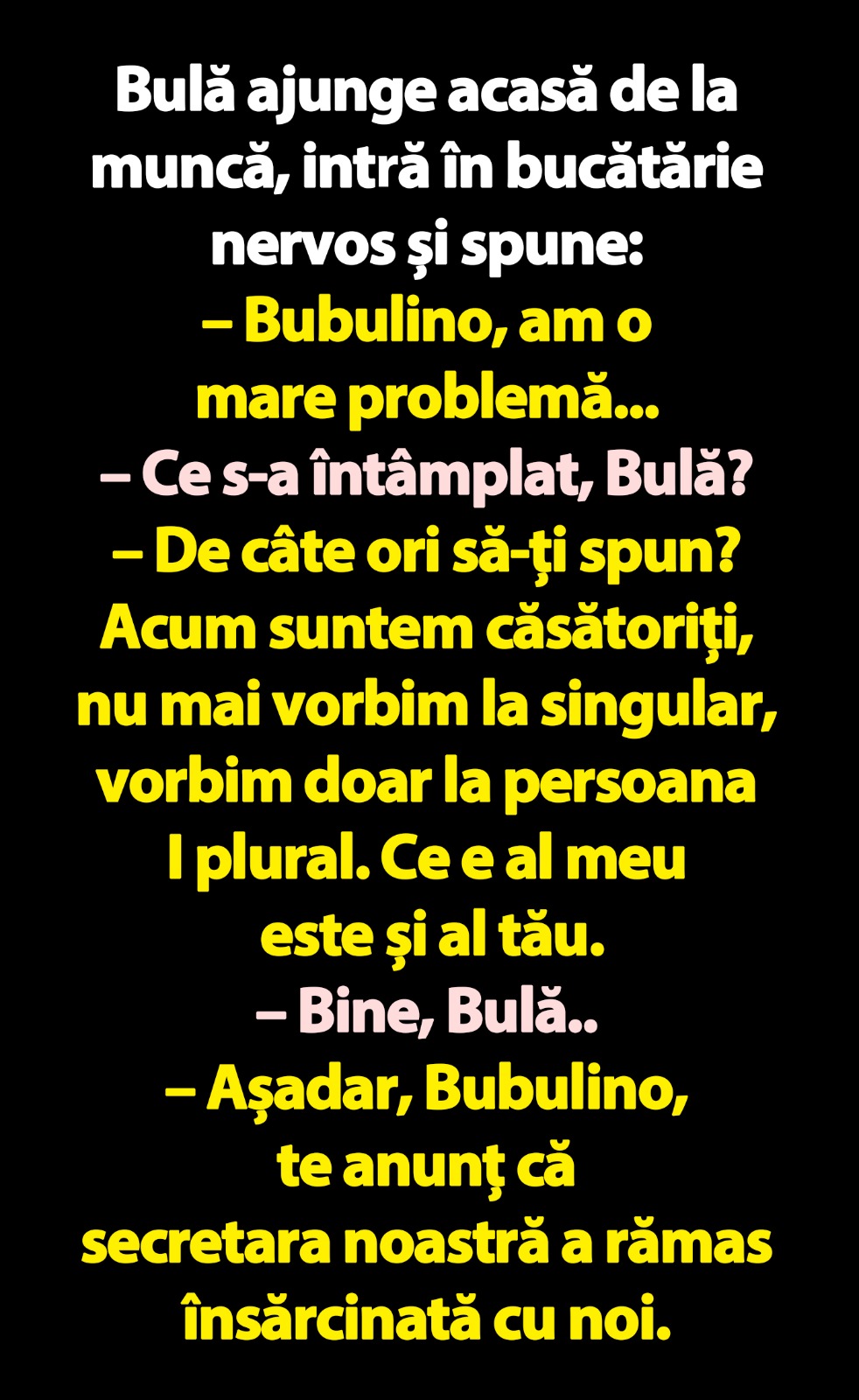 – De câte ori să-ți spun? Acum suntem căsătoriți, nu mai vorbim la singular, vorbim doar la persoana I plural. Ce e al meu este și al tău.