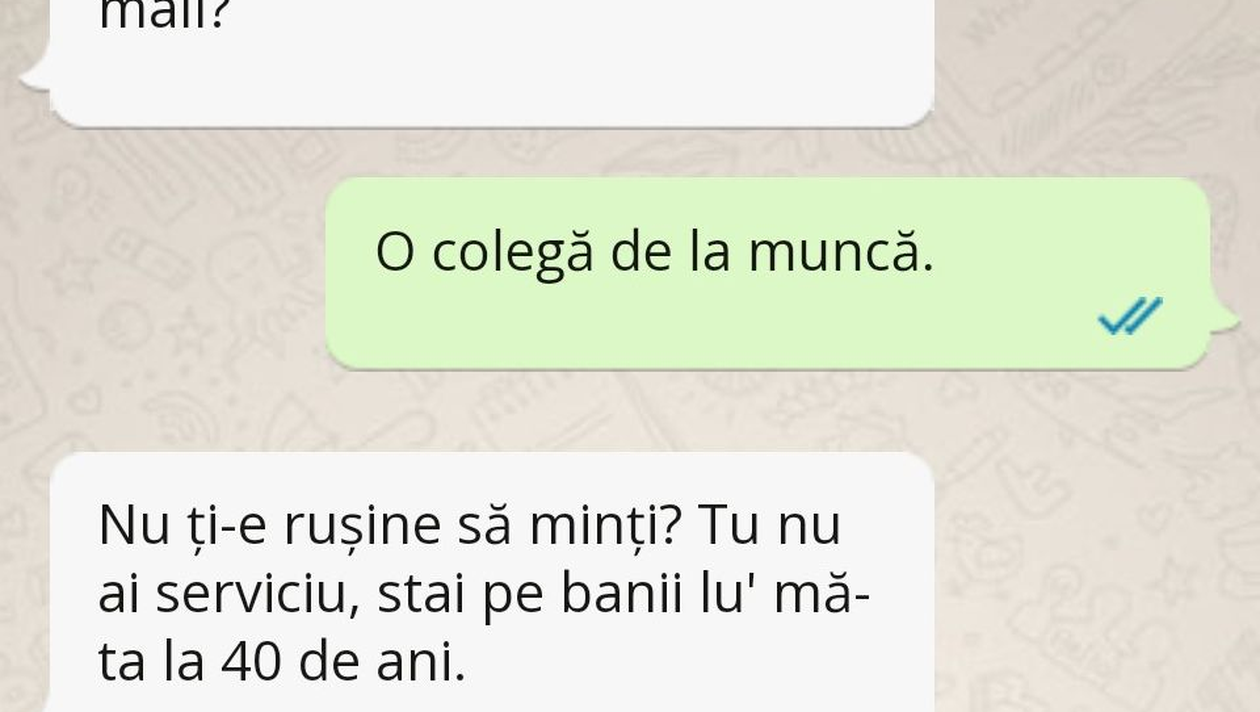 – Nu ți-e rușine să minți? Tu nu ai serviciu, stai pe banii lu’ mă-ta la 40 de ani.