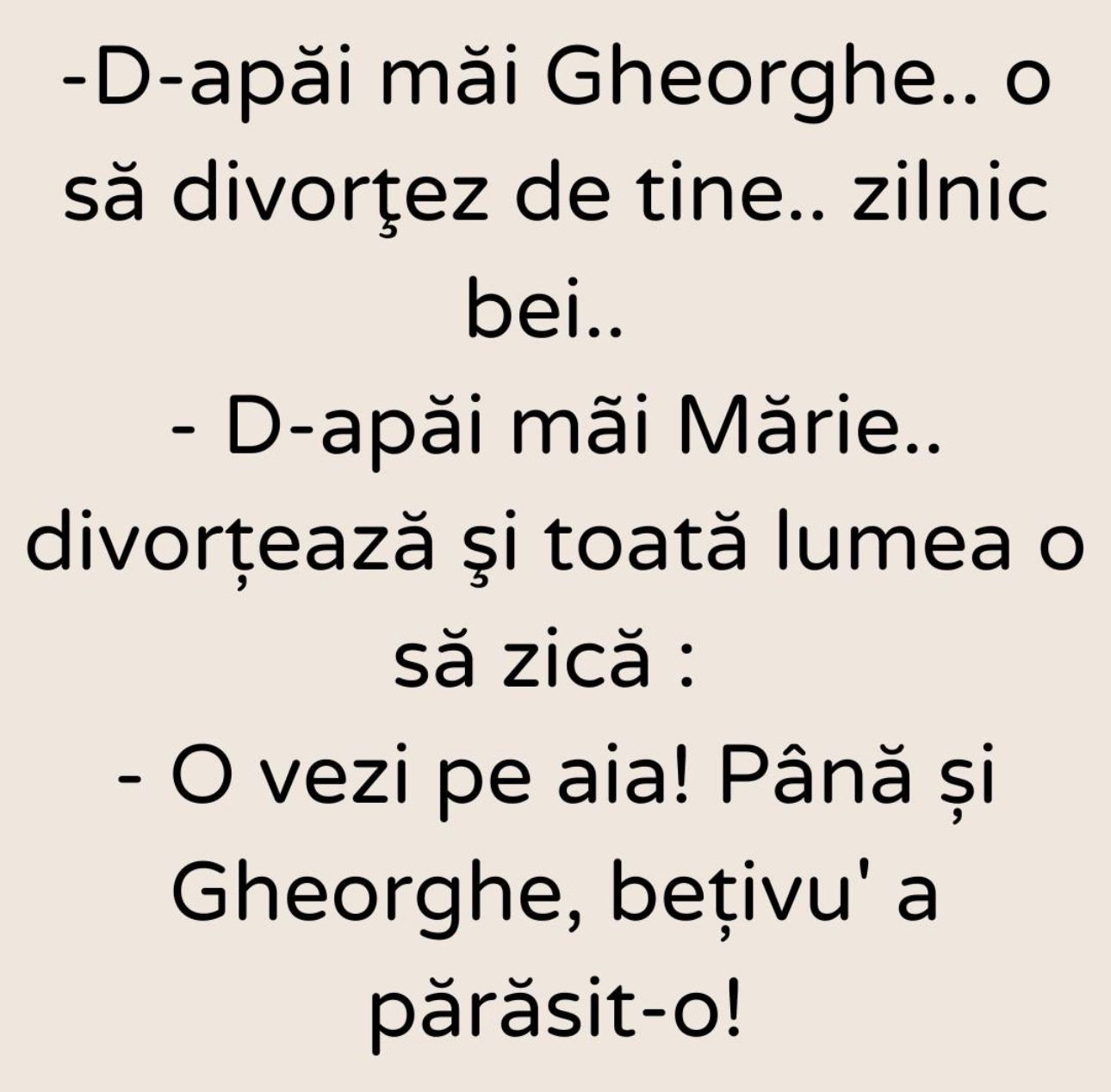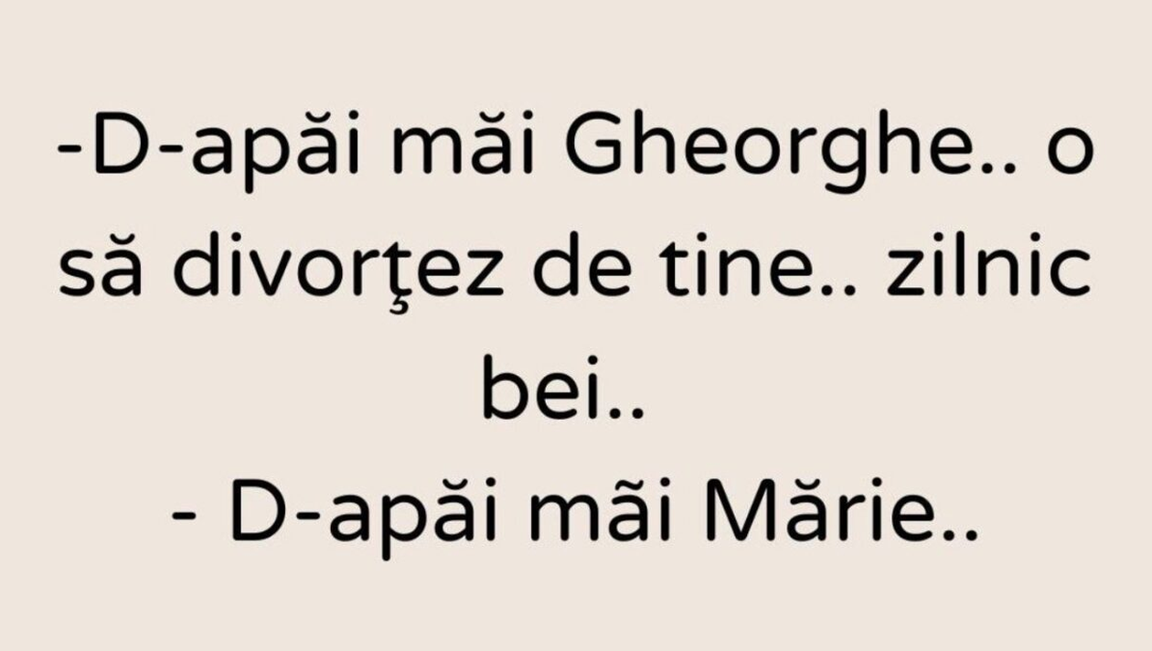 -D-apăi, măi, Mărie… divorțează! Și toată lumea o să zică: ”O vezi pe aia?! Până și Gheorghe, bețivu’, a părăsit-o!”, este bancul zilei.