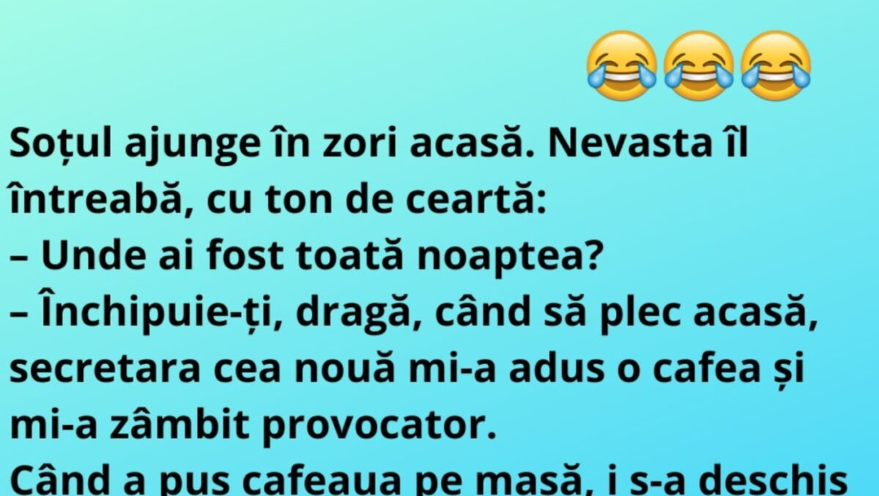 – Închipuie-ți, dragă, când să plec acasă, secretara cea nouă mi-a adus o cafea și mi-a zâmbit provocator. Când a pus cafeaua pe masă, i s-a deschis bluza și nu m-am putut abține să o sărut pe gât, la care ea a devenit sălbatică și ne-am pierdut amândoi capul. În final, am ajuns la ea acasă și am făcut dragoste nebună toată noaptea.